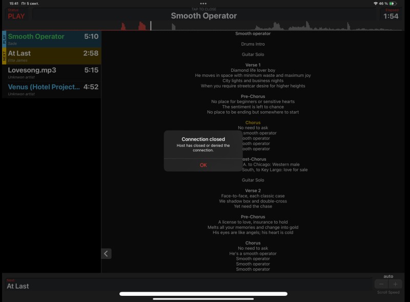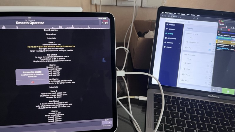 I have not been able to figure out how to reproduce this problem. It might be related to minimizing the app on my MacBook (for example, when I open Finder while the app is running, although I don’t always do this). Another possible cause could be when the iPad screen gets locked. After these actions, network issues seem to occur. However, I cannot say for certain what exactly causes the failure, because during performances I do neither of these things.