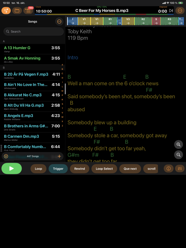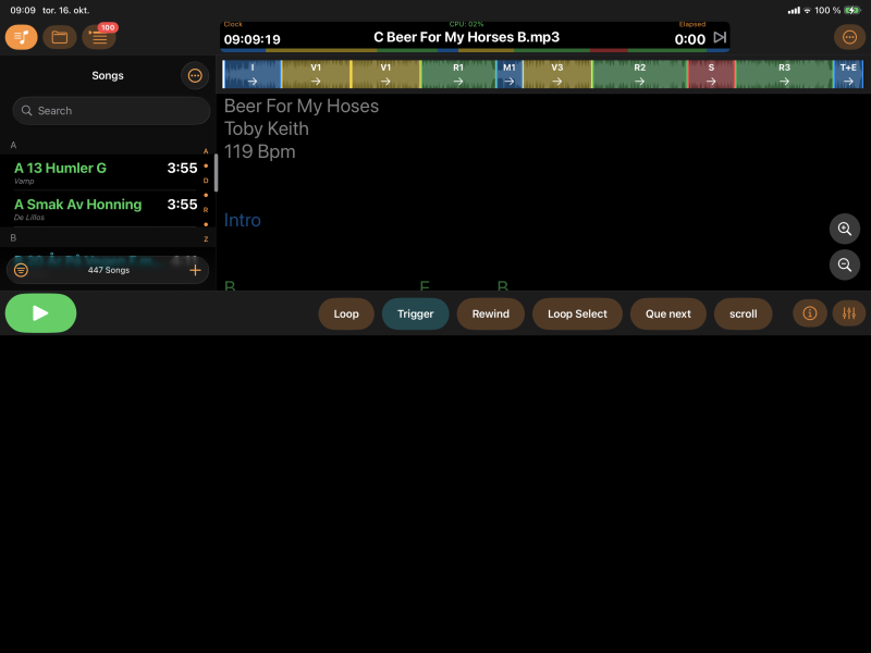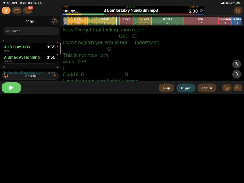 - ensuring I had Song List view open in side bar AND a lyric sheet with regions defined AND waveform turned on (to replicate the screenshot conditions)