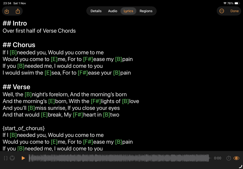 I have been tidying up some lyrics and noticed an issue with chord alignment when using centered text. The screenshots below should explain pretty clearly what is happening. Basically, when centered text is off, the alignment is pretty accurate, when centered is on it is way off.